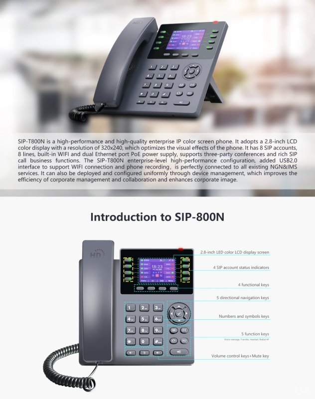 - Функции телефона: удержание вызова, отключение звука, перевод вызова (безусловный перевод, перевод при отсутствии ответа, перевод при занятости), многосторонняя конференция, ожидание вызова, персонализированные мелодии звонка, импортзагрузка адресной книги, автоматический ответ. Он может хранить 500 телефонных номеров, 1000 записей вызовов и 1200 записей всех вызовов. Может поддерживать черный список (опционально); может поддерживать функцию зашифрованного вызова.