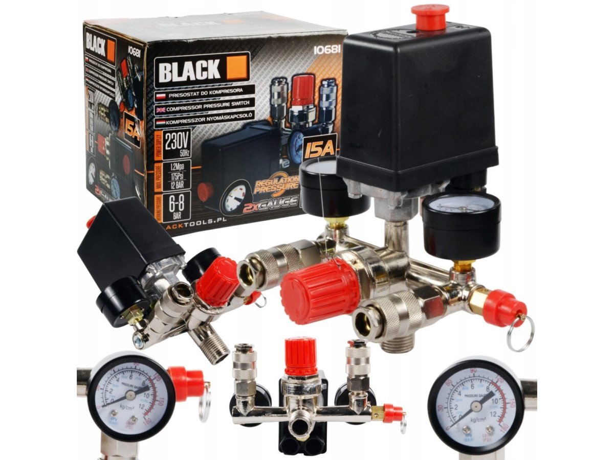 Բարձր որակի ճնշման անջատիչ (պրեսոստատ) կոլեկտորով, երկու արագ միակցիչներով և մանոմետրերով, նախատեսված 230V կոմպրեսորների համար։ Պրեսոստատը հիմնականում կիրառվում է 24 լ, 50 լ, 100 լ, 200 լ, 300 լ տարողությամբ կոմպրեսորներում։